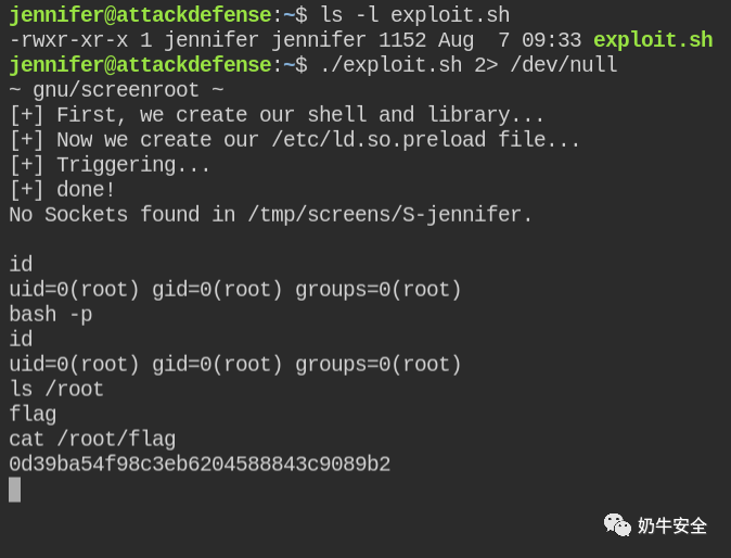 漏洞:可以通过启用 setuid 位的screen来滥用 ld.so.preload 覆盖获取root shell。编译后的库将以 EUID 值为 0 运行,然后可以使用它来调用 setuid 函数并获得 root 特权 shell