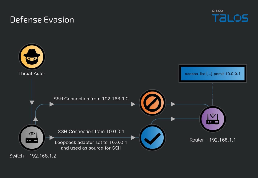 攻击者试图通过改变环回地址来绕过 ACL、清除日志来隐藏活动、禁用 Guest Shell 以及修改 AAA 设置以进行未经授权的访问,从而逃避检测。