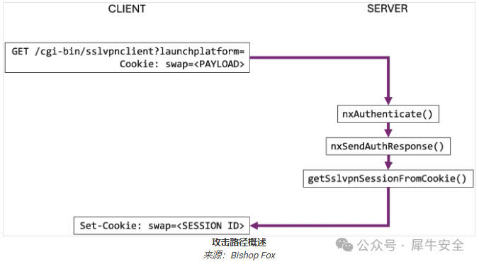 该漏洞的工作原理是将一个包含 base64 编码的空字节字符串的特制会话 cookie 发送到“/cgi-bin/sslvpnclient”的 SSL VPN 身份验证端点。