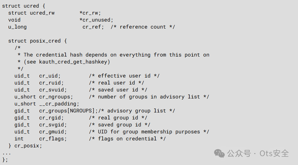 XNU 中的凭据 ( struct ucred) 是一种数据结构,用于跟踪许多与安全相关的字段,例如线程的用户 ID。以下是 ucred 的定义: