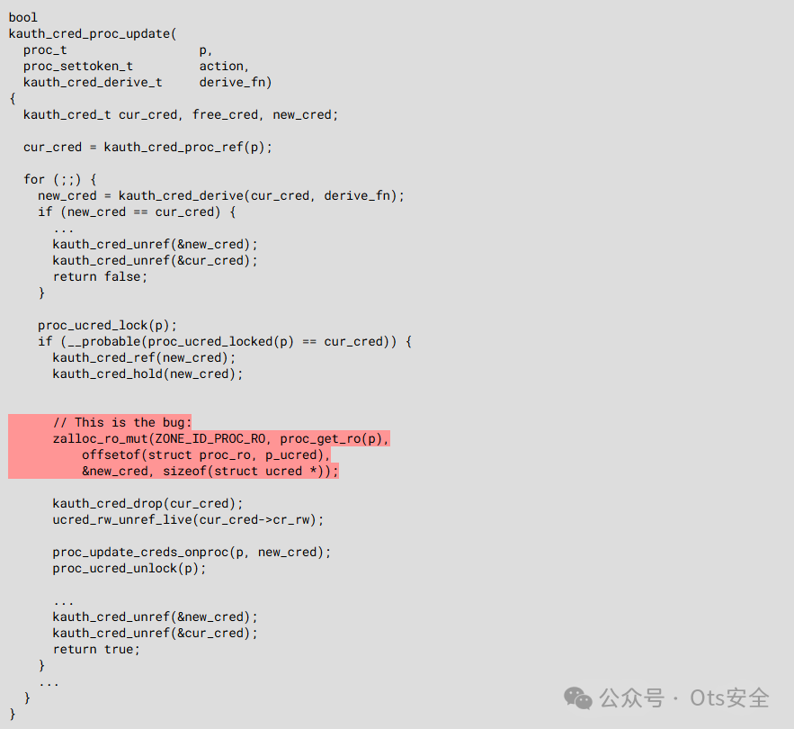 该错误存在于 中kauth_cred_proc_update,这是负责更新 指针的函数proc_ro。p_ucred我用红色突出显示了有缺陷的行。
