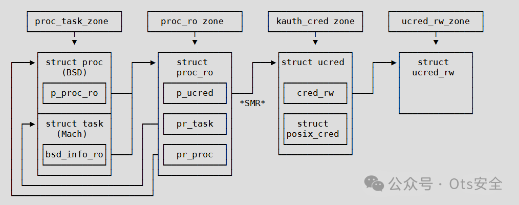 每个进程都有一个struct proc和struct task(彼此相邻分配)。BSD 世界使用struct proc,而 Mach 世界使用struct task。这两个结构都指向一个匹配的struct proc_ro,而后者又指向它们两个。
