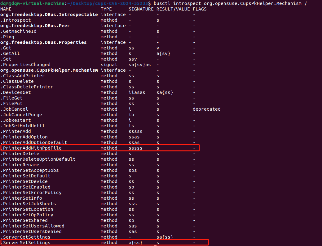 org.opensuse.CupsPkHelper.Mechanism。这是一个与打印系统(CUPS)相关的服务,提供了一些方法,涉及参数设置,打印机创建等操作。这里可以使用