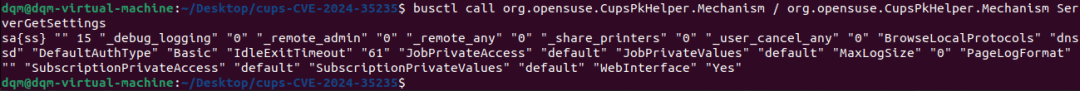 其中的接口ServerGetSettings,ServerSetSettings分别用来查看以及设置CUPS的运行参数。在每次设置参数(即调用ServerSetSettings)后,CUPS都会进行一次重启以加载新的配置。(在后文中,我们将多次调用该方法。)