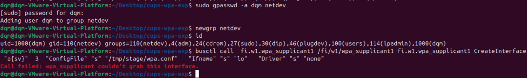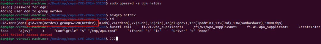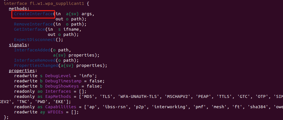 因此,在ubuntu22.04上,wpa_supplicant服务并没有使用netdev组调用接口CreateInterface,导致该漏洞无法利用。