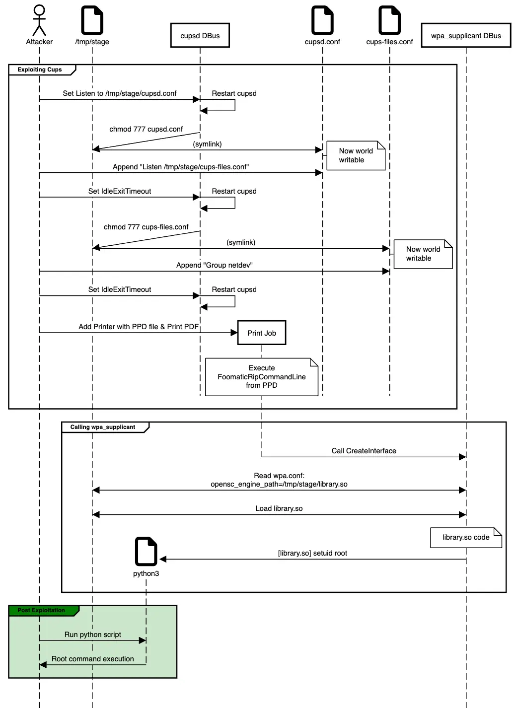 cupsd服务器时,由于对符号链接文件解析的不当处理,攻击者可以通过创建特定的符号链接文件,使CUPS(以root权限运行的进程)将任意文件的权限更改为777,从而使文件对所有用户可写。