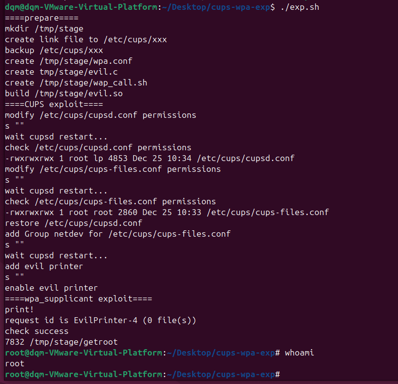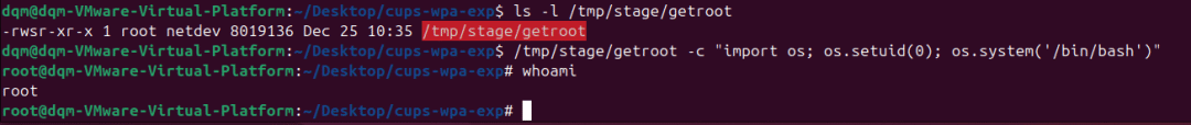 使用新创建的打印机打印文件,这将触发对wpa_supplicant的Dbus方法的调用。调用结束后,将在/tmp/stage目录下生成一个带有SUID属性的python3程序。
