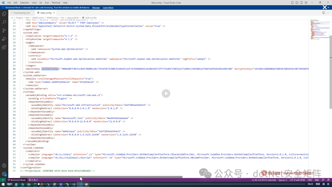 为保护ViewState免受篡改和信息泄露,.NET页面框架使用机器密钥:ValidationKey和DecryptionKey。这些密钥可自动生成并存储在注册表中,也可在配置文件中手动指定。