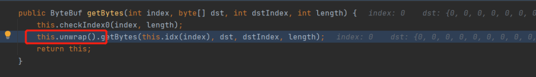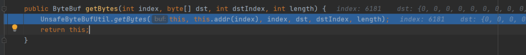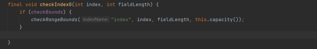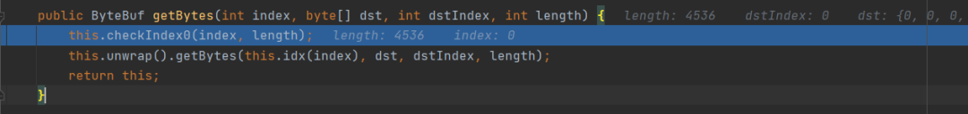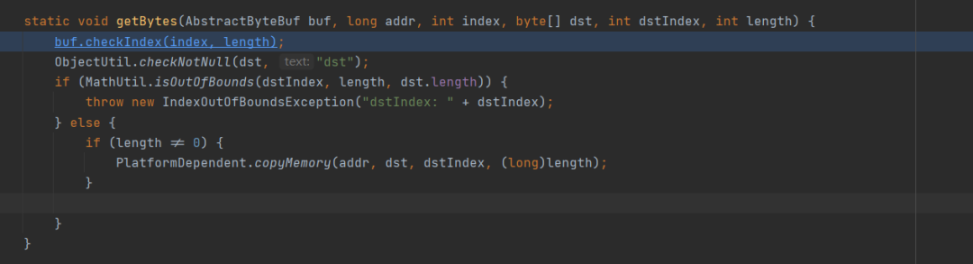 终于在UnsafeByteBufUtil类的getBytes方法这里找到了校验方法(ensureAccessible)的调用