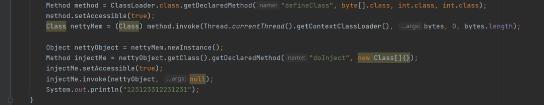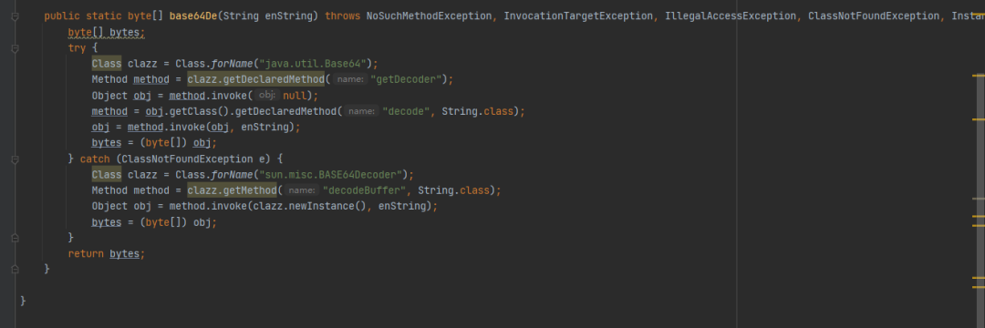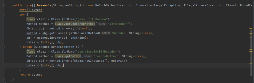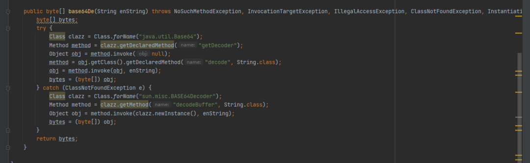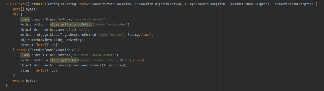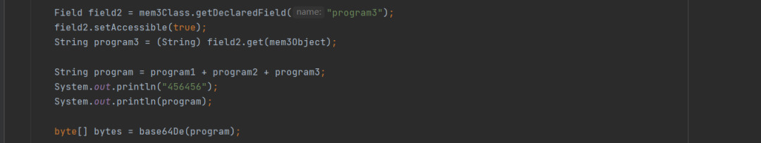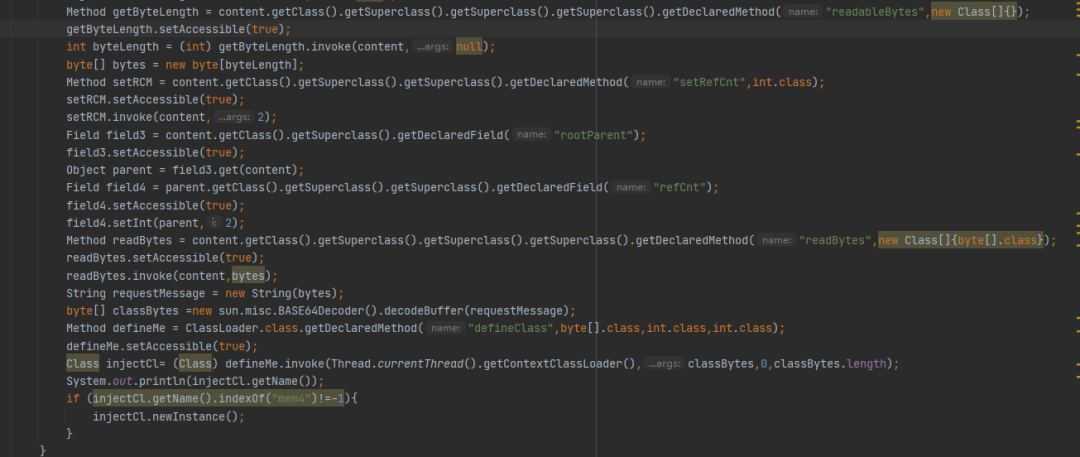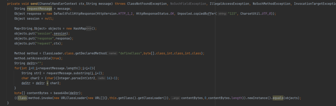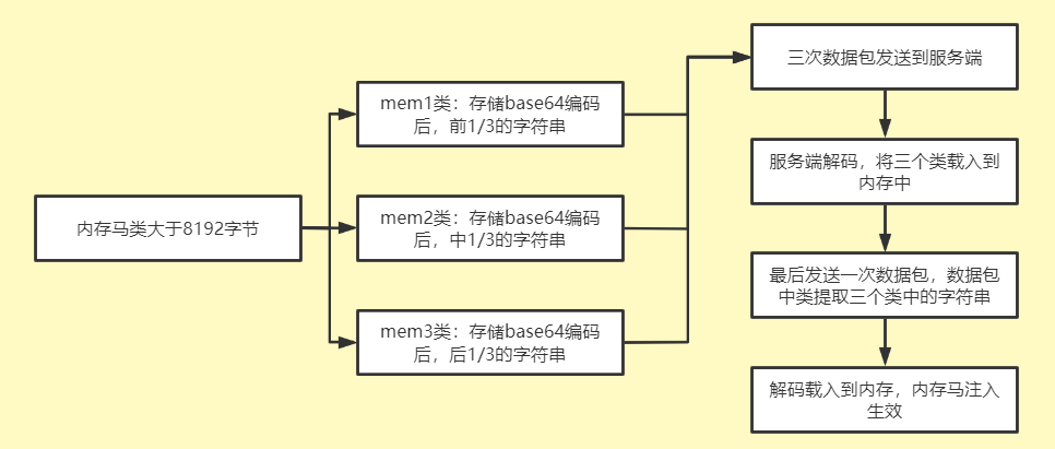 在找到了存储body位置的信息之后,发现这里只能保存不超过8192字节的数据,那么这里想出的解决方案,是把将要在类中运行的字节码base64编码之后保存在三个类中,这个时候需要发送三次数据包,然后,最后一个数据包将前三个类中保存的base64字符串解码,注入到内存中