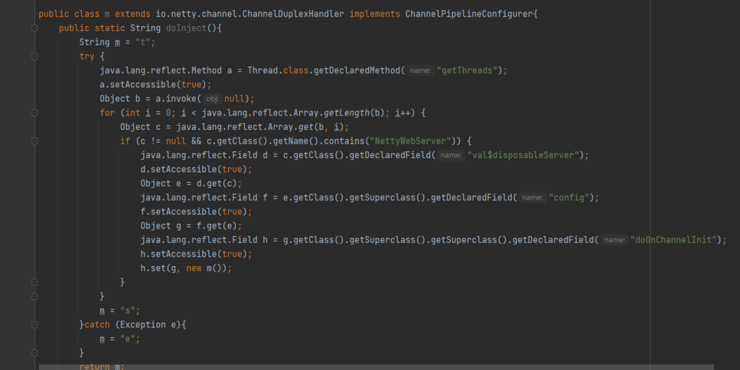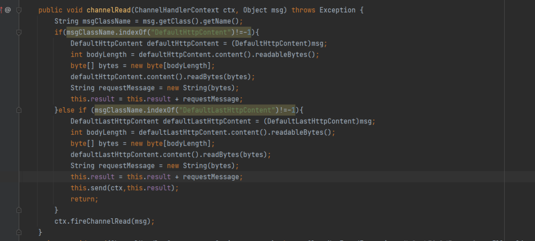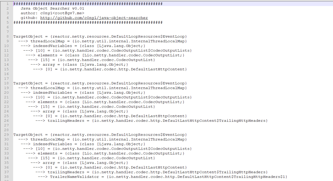 虽然function的netty一句话内存马已经有了,打起来还是冰蝎方便些,因为Header头不能过大,所以这里选择的方案是通过线程获取到post的body,然后对body中的class进行反射调用,通过Java-Object-Searcher工具这里找到了内存中存储body的信息位置-io.netty.handler.codec.http.DefaultLastHttpContent