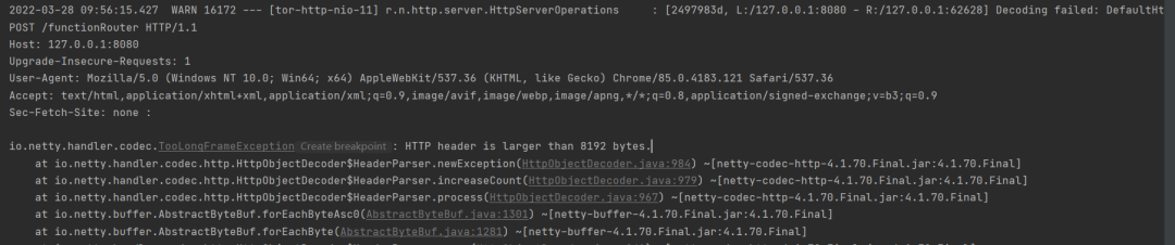 当直接把这个payload放入到header头的时候,由于header头过大导致报错