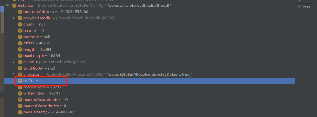 那么还是解决第一个问题的方法,修改refCnt的值,这里需要注意的第二次refCnt所属的对象类为PooledUnsafeDirectByteBuf,第一次refCnt所属的对象类为PooledSlicedByteBuf,而第二次refCnt所属的对象存储在第一次refCnt所属的对象类的rootParent变量中
