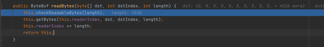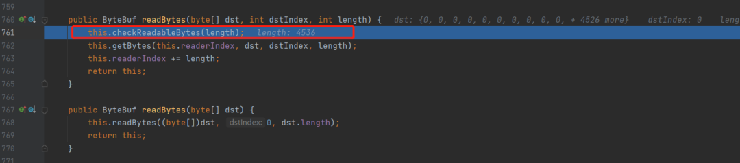 字符串发送到服务端后,服务端接收的字节大小是没有问题的,问题是无法读取字节信息,即DefaultLastHttpContent的readBytes方法出现了问题,随即debug跟进,实际上这里的readBytes是调用父类AbstractByteBuf的方法,接着跟进checkReadableBytes