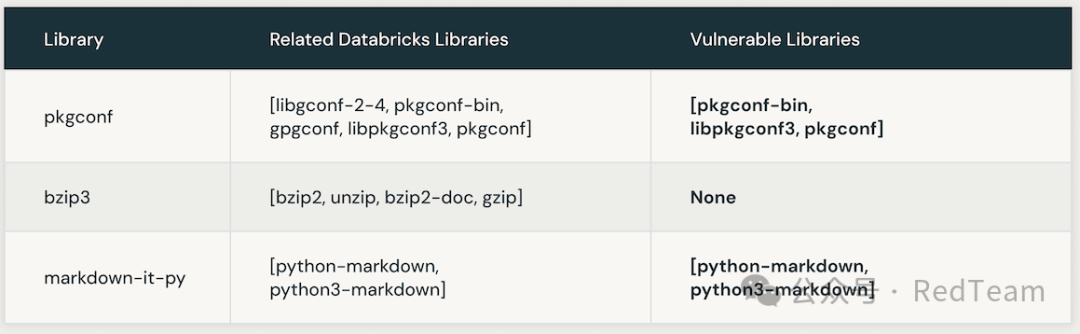 下面的表格展示了与特定CVE相关的Databricks漏洞库实例。首先,通过人工智能相似性搜索来定位与CVE库密切相关的库。接着,使用LLM来验证这些相似库在Databricks中的漏洞。
