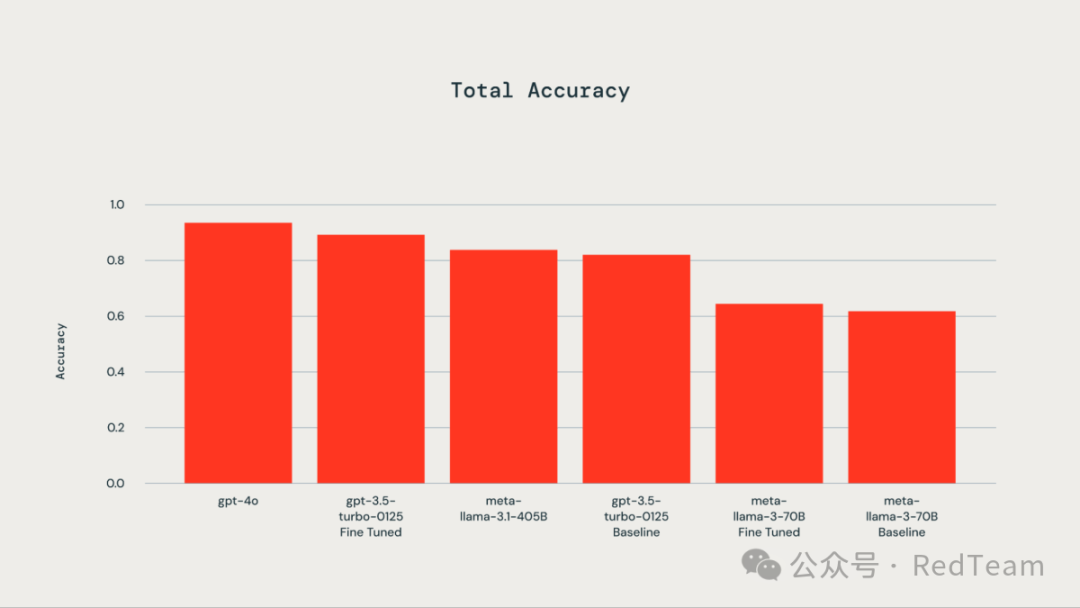 下图展示了各种LLM微调后的准确度比较。通过对gpt-3.5-turbo-0125进行微调后,其准确率得到了显著提升,而llama3-70B在微调后的改进幅度较小,接近gpt-3.5-turbo-0125的表现。其他模型,如gpt-4o和llama-3.1-405b-instruct,表现出类似的微调效果。