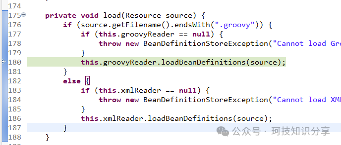 核心加载方法位于BeanDefinitionLoader.load(Resource) line: 180