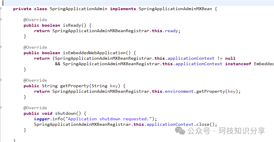 具体代码位于org.springframework.boot.admin.SpringApplicationAdminMXBeanRegistrar$SpringApplicationAdmin