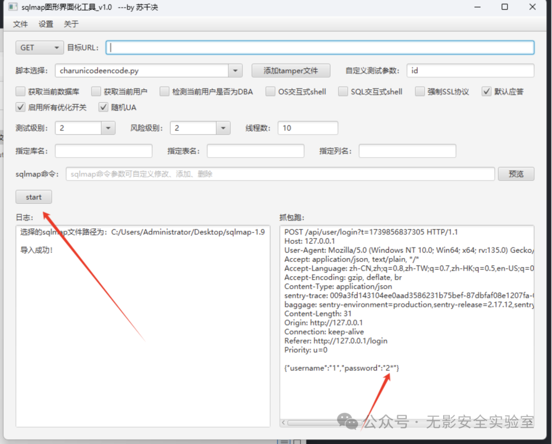 关于抓包跑,可直接在burp抓包,复制请求包粘贴到文本框中,在需要测试的地方加上 * 点击start即可 其他地方不需要改,可以选择需要的脚本和一些功能项等等 注:当预览框和抓包跑文本框都有信息时,优先会运行预览框命令