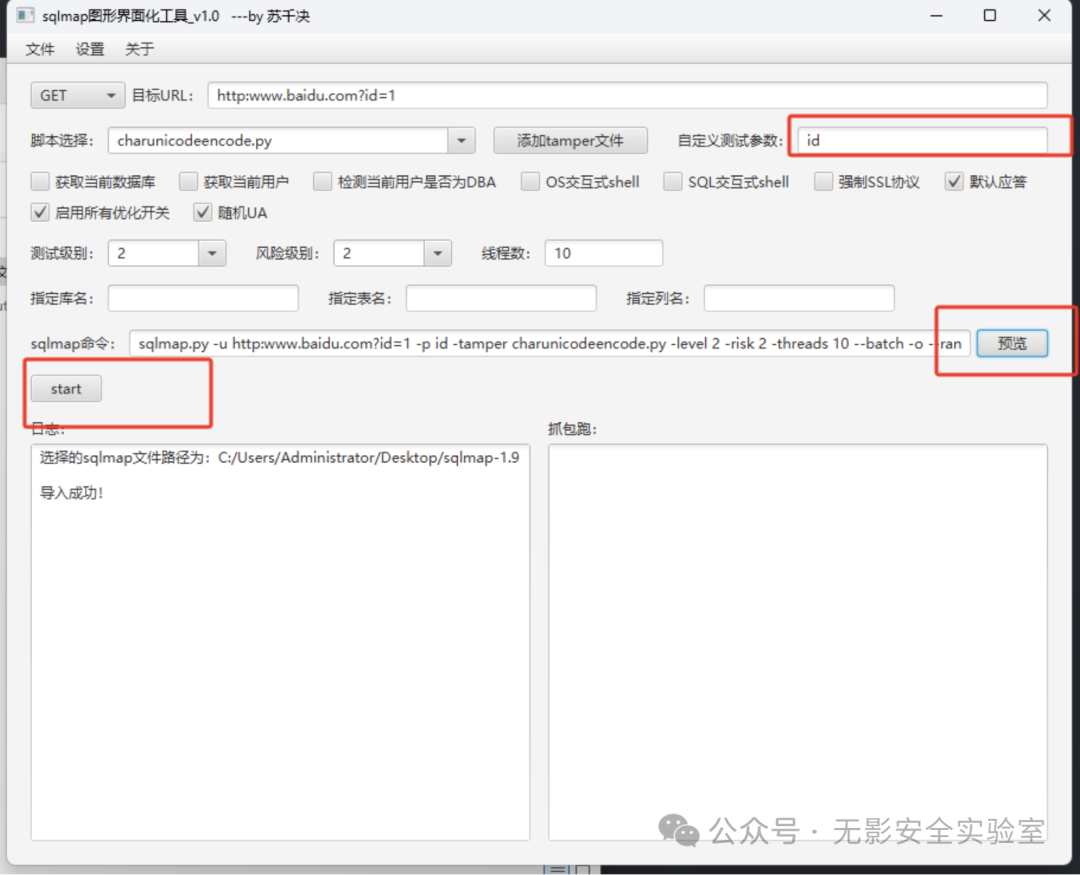 自定义参数在GET请求下就是sqlmap的 -p id ,POST请求就是sqlmap的 -data id=1,GET/POST请求可在url那一行最左边选 测试级别、风险级别、线程数、库、表、列都可以自定义,还有一些可自选的功能项 选择完后点击预览按钮,则会生成sqlmap语句在预览框中显示,可以自定义调整,修改、删除、添加 然后点击start就是开始运行 注:必须先点预览,预览框中出现了命令才能点start运行