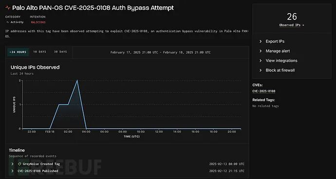 3. 监测攻击行为:借助 GreyNoise 等威胁情报平台,实时跟踪与 CVE-2025-0108 相关的恶意 IP 地址。
