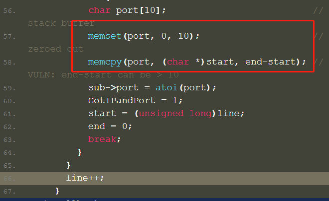 并把port的值通过atoi函数转换成一个整数,这里由于校验不完整可以构造一个port的参数36557AAAAA*100,拷贝的port的缓冲区中造成溢出。