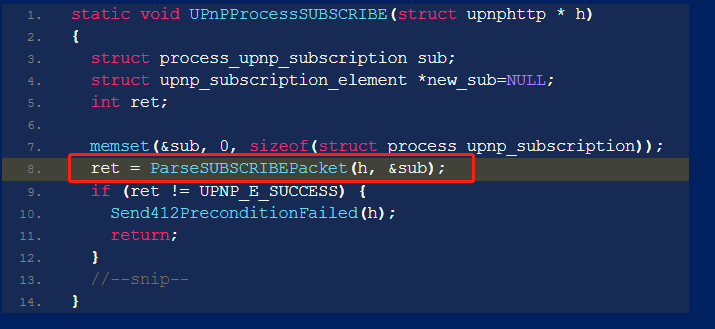 在第8行,函数UPnPProcessSUBSCRIBE会解析存储在结构体upnphttp中的HTTP请求,然后将其填充到提供的结构体process_upnp_subscription的字段中。