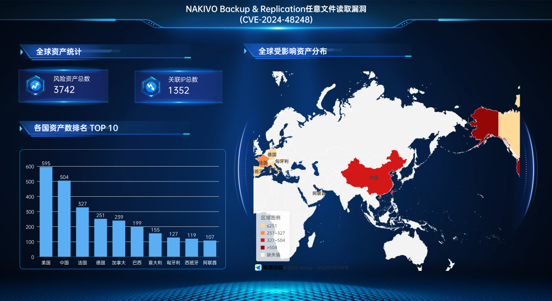 奇安信鹰图资产测绘平台数据显示,NAKIVO Backup & Replication任意文件读取漏洞(CVE-2024-48248)
