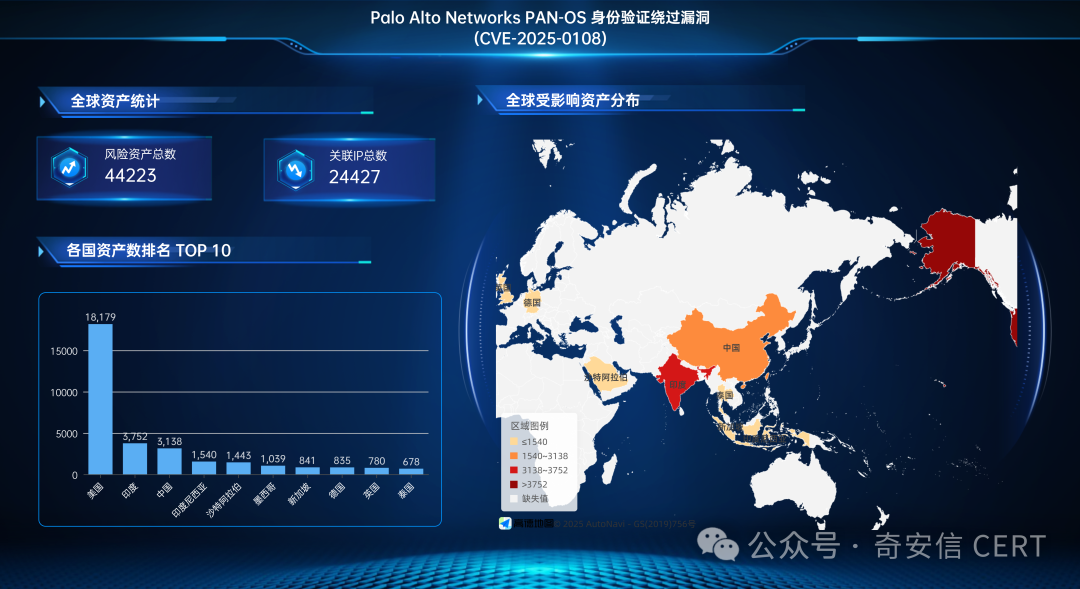 奇安信鹰图资产测绘平台数据显示,Palo Alto Networks PAN-OS 身份验证绕过漏洞(CVE-2025-0108)
