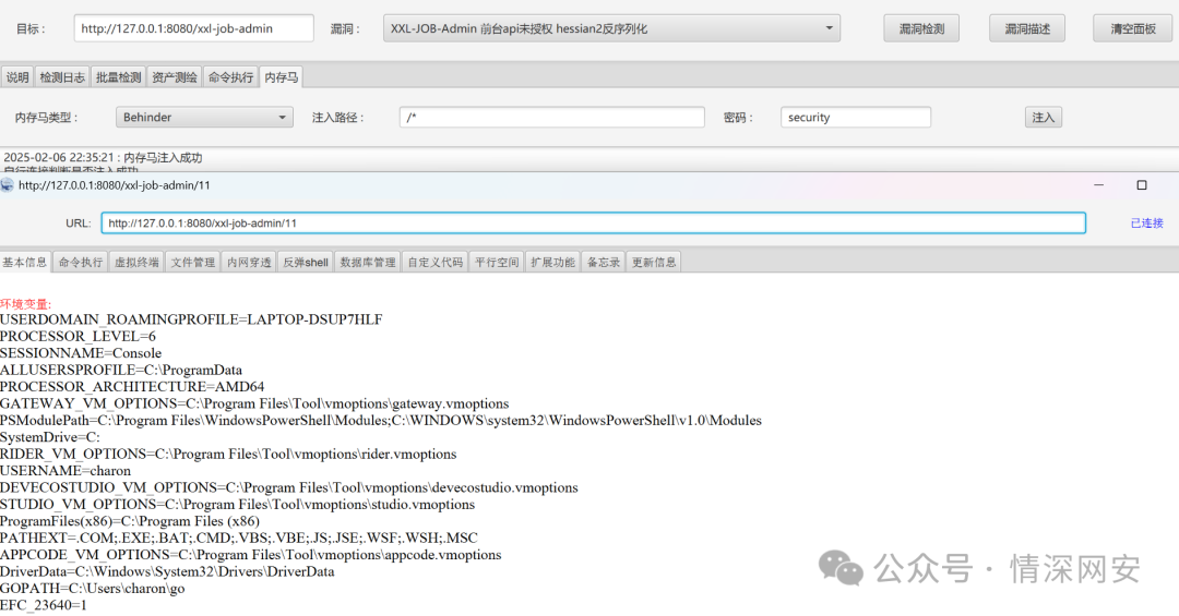 当然以上的代码已经可以实现了漏洞利用,下面对其进行工具封装,已经实现了内存马注入,命令执行