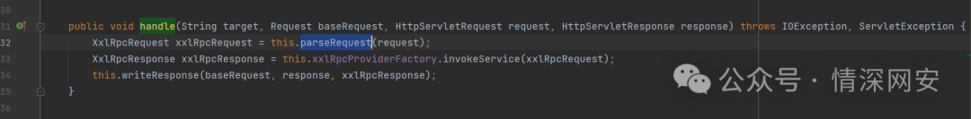 继续跟进handle,来到com.xxl.rpc.remoting.net.impl.jetty.server.JettyServerHandler#handle,这里会将传入的request交给parseRequest进行处理