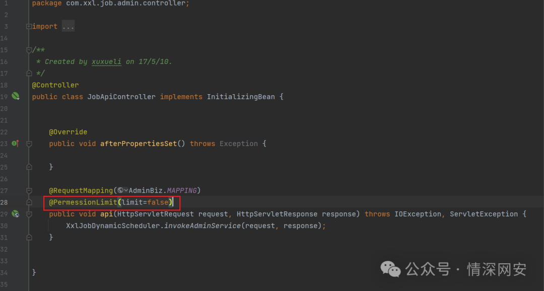 进入com.xxl.job.admin.controller.JobApiController,发现这里默认关闭了权限控制,导致api可以未授权访问,这里就是/api路由的入口点,这里传入请求对象request