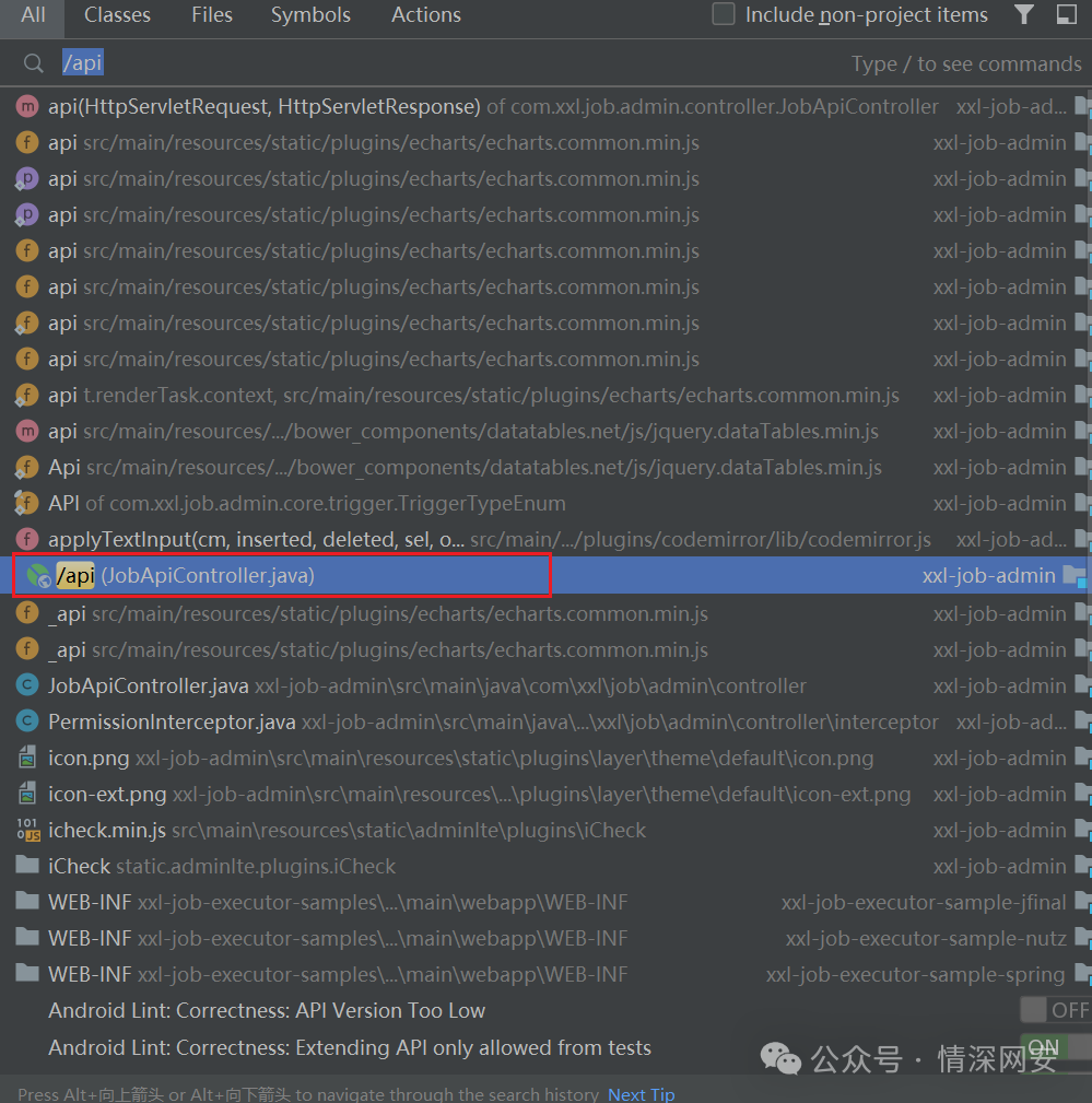 访问 http://127.0.0.1:8080/xxl-job-admin/api 时,可发现这是一个未授权访问,先全局搜索/api关键词,可以定位到是在JobApiController中管理/api这个路由