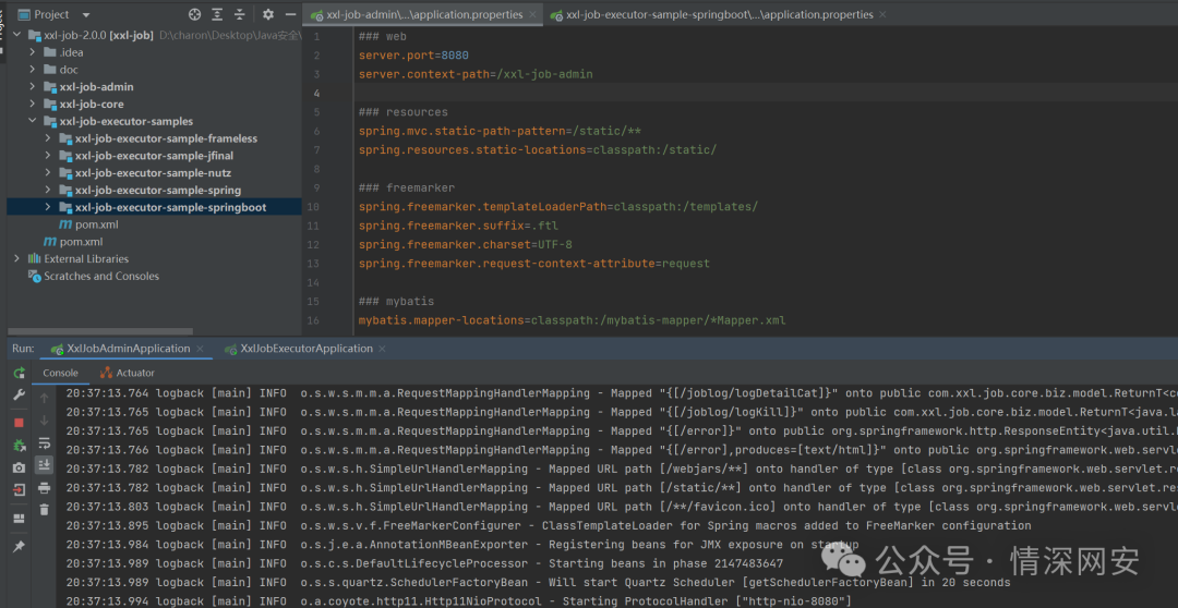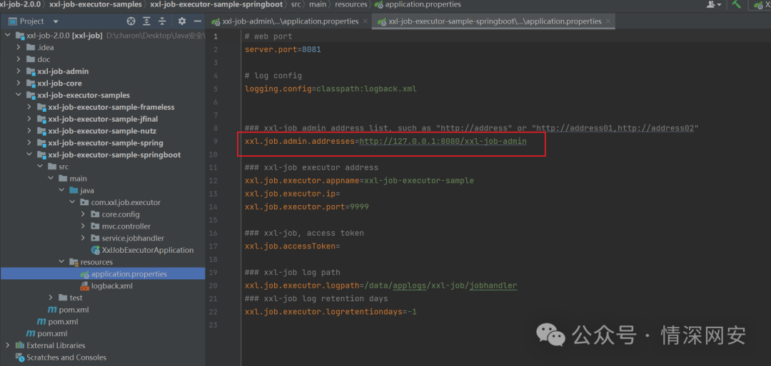 如果修改了管理端默认端口8080,同时也得修改执行端中的对应地址端口,/xxl-job-2.0.1/xxl-job-executor-samples/xxl-job-executor-sample-springboot/src/main/resources/application.properties