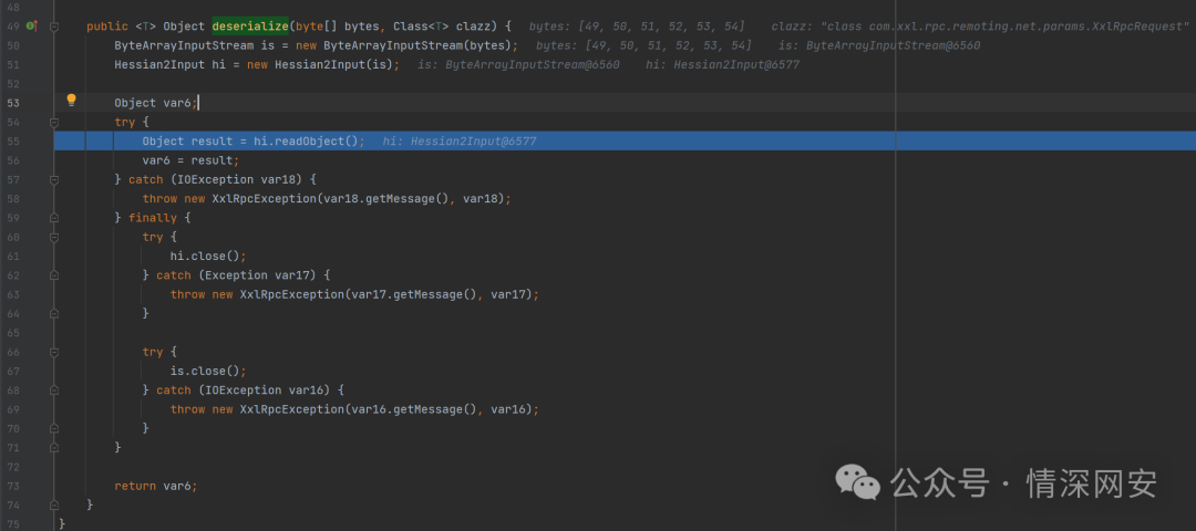 断点步入deserialize方法,来到com.xxl.rpc.serialize.impl.HessianSerializer#deserialize,发现调用了Hessian2Input的readObject方法,所以确定后端是使用 Hessian 2 协议将字节数组反序列化为指定类型的对象