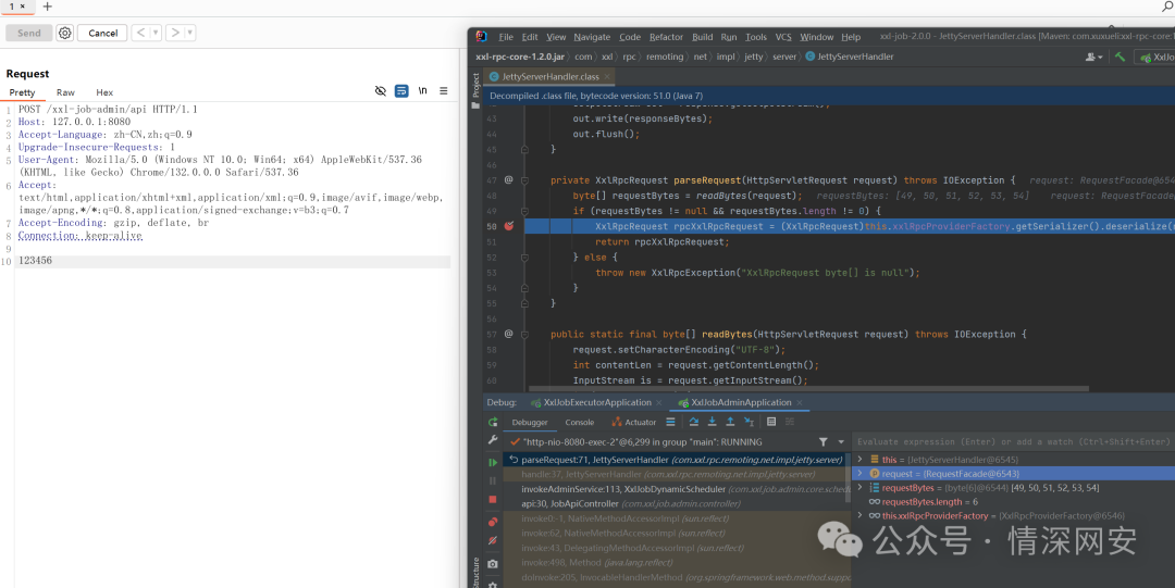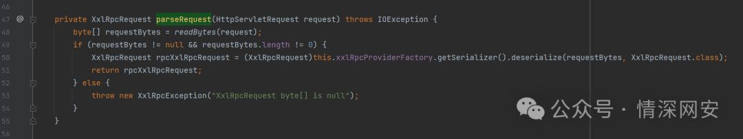 继续跟进parseRequest,来到com.xxl.rpc.remoting.net.impl.jetty.server.JettyServerHandler#parseRequest,首先从request中读取请求体,将其转换为字节数组,然后判断字节数组是否为空,如果为空则抛出异常;如果不为空,则进行反序列化