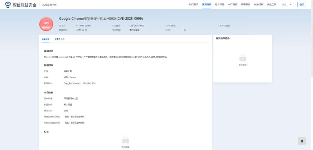 2025年2月19日,深瞳漏洞实验室监测到一则谷歌-Chrome组件存在缓冲区溢出漏洞的信息,漏洞编号:CVE-2025-0999,漏洞威胁等级:高危。