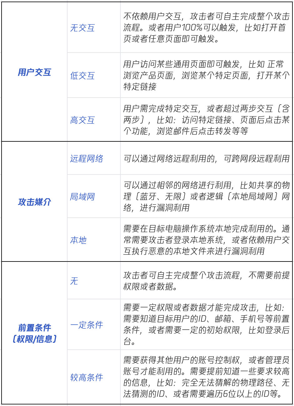 目前评级原则已调整为根据技术维度和业务维度综合评估,技术维度主要包括用户交互、攻击媒介、前置条件三个方面。