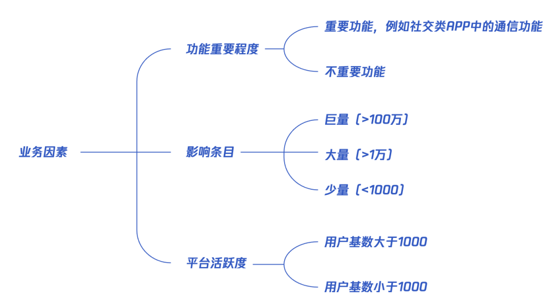 业务维度主要包括功能重要程度、影响数量、平台活跃度等。
