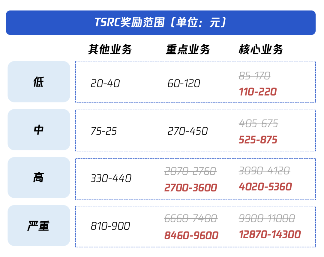 在原有贡献值体系的奖励基础上,提升了核心业务漏洞奖励,以及重点业务的高危及严重漏洞奖励。