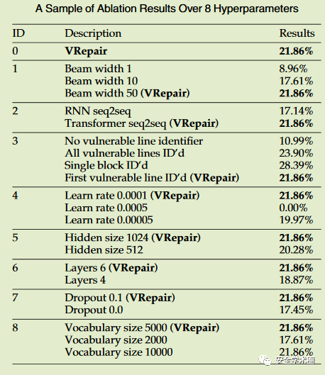 VRepair 生成补丁后,由人类、测试组或静态分析器进行验证。例如,如果漏洞是由静态分析器发现的,则可以通过同一个静态分析器再次验证已打补丁的程序,以确认该漏洞已被 VRepair 修复。由于此评估可能会消耗时间和资源,因此提出了一种新的 Beam 称为 VRepair beam 改进 Beam Search,通过限制 VRepair beam 来评估 VRepair 系统的输出,该限制代表 VRepair 提出的用于再次验证的程序数量。