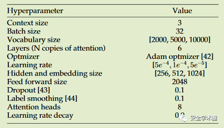接下来,使用bug修复验证数据集来选择bug修复数据集训练产生的最佳模型,并在漏洞修复数据集上对其进行调整。所有的处理和bug修复数据集训练阶段处理一致。为了确保每个 “CWE-xxx ” 特殊token有足够的训练数据,统计出最常见的CWE ID,并且只保留词汇表中具有足够例子的CWE ID。作者保留的CWE ID涵盖了所有漏洞的80%,而没有保留在词汇表中的CWE ID则被替换为’CWE-000’。这里还使用了早期停止,具有最高验证精度的模型被用于补丁生成。