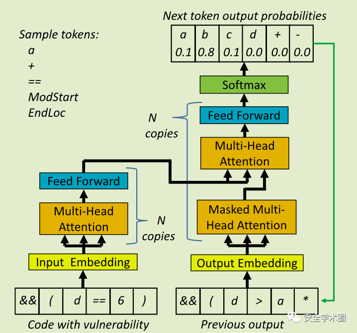 首先,模型接收经3.1.1.节处理过的漏洞代码;多头注意力层的多个副本学习输入数据的隐藏表示;然后第二组多头注意力层使用这些表示来生成最有可能输出的标记的概率表;此外,作者使用了一种复制机制Incorporating copying mechanism in sequence-to-sequence learning、SequenceR: Sequence-to-Sequence Learning for End-to-End Program Repair,训练一个替代神经网络学习将输入token复制到输出,以减少所需的词汇量。输出的第一个token完全基于模型已经从输入代码学习的隐藏表示所产生的。当token输出时,它们可以作为模型的输入,因此它可以正确地调整下一个令牌的概率。例如,在图3中,令牌’ && (d > a* ‘序列输出后,模型预测下一个令牌应该是’ b ‘,概率为0.8