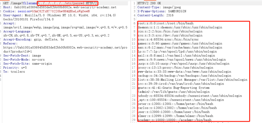 如下站点存在一个图片展示功功能,获取对应图片时,由于没有对用户输入限制进行限制,攻击者可以控制传递至服务端的filename路径参数,导致任意文件读取漏洞的产生,利用该漏洞可以对服务器内部文件进行读取。