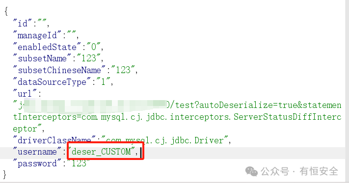jdbc:mysql://ip:port/test?autoDeserialize=true&statementInterceptors=com.mysql.cj.jdbc.interceptors.ServerStatusDiffInterceptor