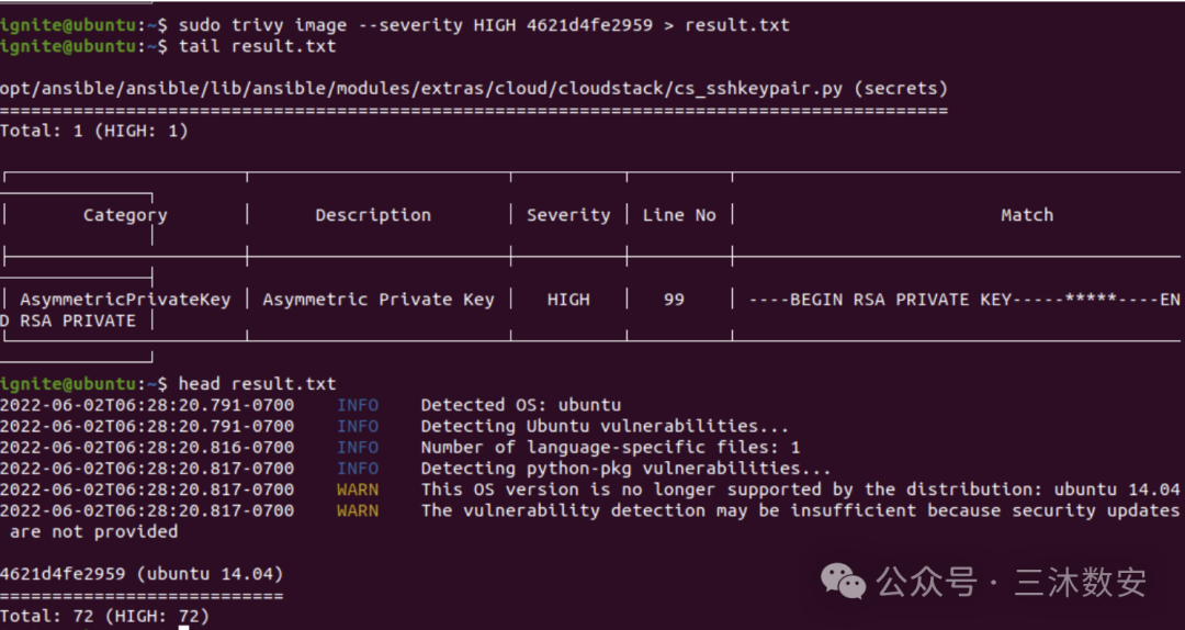 sudo trivy image --severity HIGH 4621d4fe2959 > result.txt